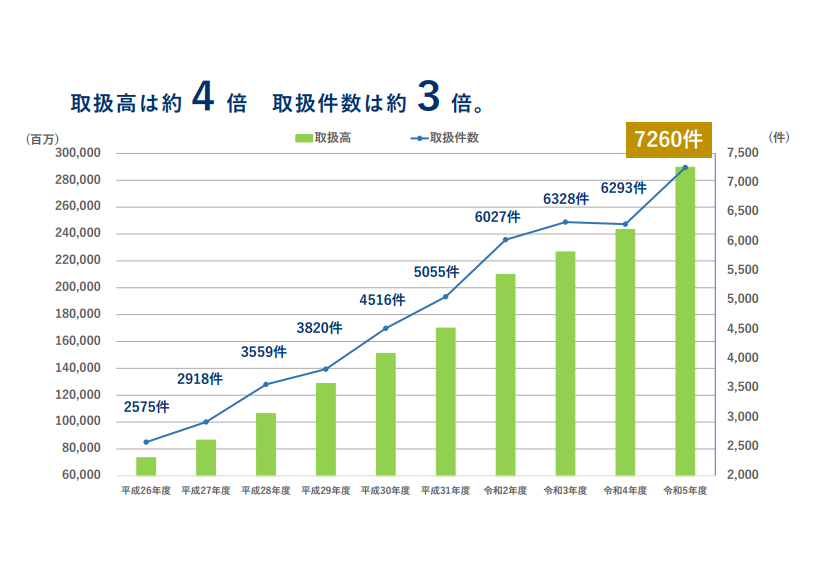 東宝ハウスライフソリューションズグループは、居住用不動産の売買に特化した営業を行っている不動産流通企業で、年間におおよそ6000件の売買に携わり、2019年度以降、全国トップ10、2023年度以降は全国トップ8に入ることが出来ました。