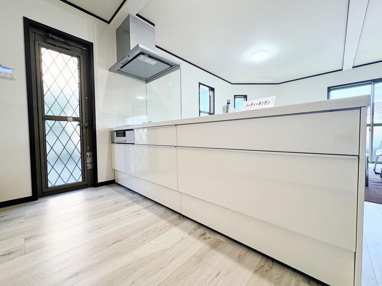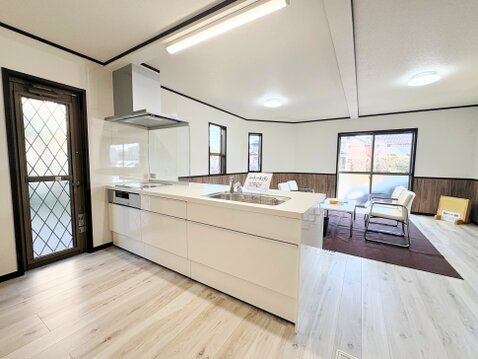 リビングには床暖房完備。キッチンからリビング全体を見渡せます。
