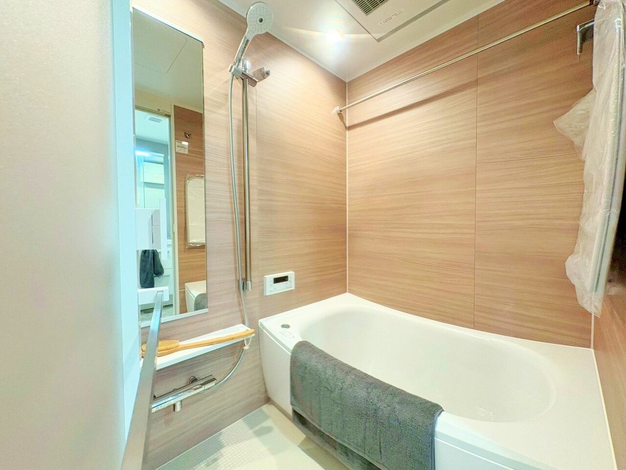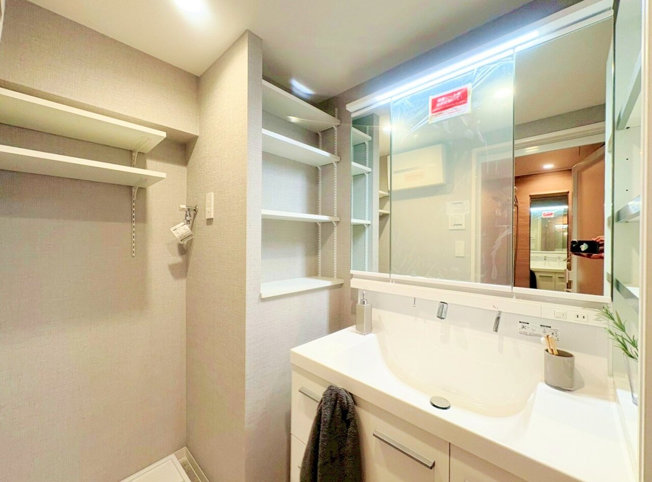 外出前の身支度チェックにも便利な鏡付きの収納を備えました。