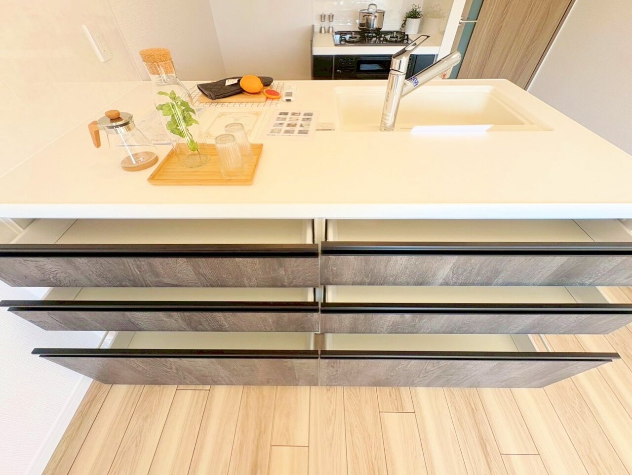 ダイニングに座るご家族やお客様と会話しながらお料理ができます。